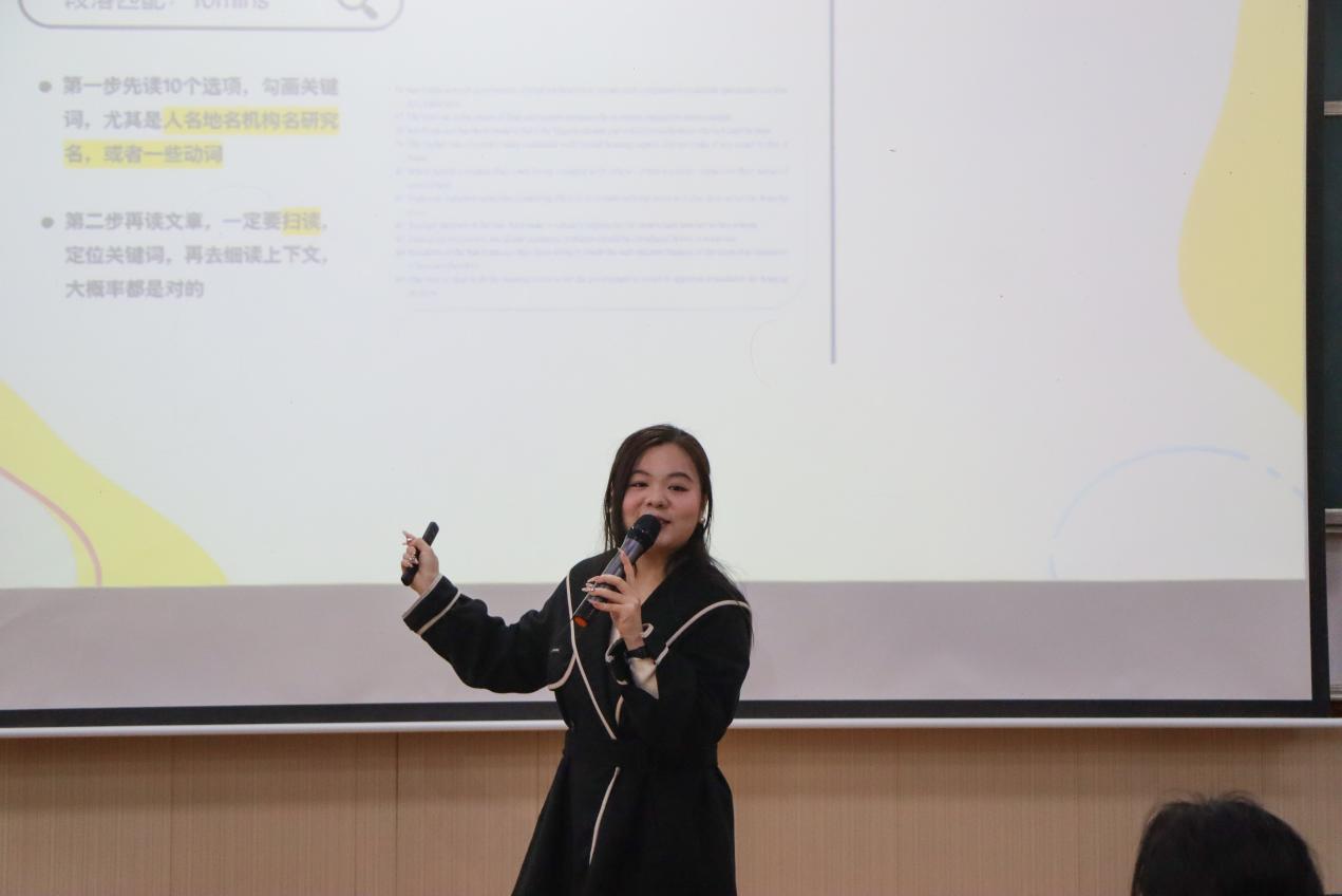 为帮助同学们解答在备战四六级中遇到的问题,熟悉四六级考试流程,增强备考英语四六级的积极性和自信心,在学院内营造良好的英语学习氛围,12月1日上午,外国语学院和历史文化学院联合主办的“试在必得”四六级经验分享会在1201教室举办。外国语学院2022级英语专业本科生邵可涵为主讲人,外院主持队队员喻本好担任主持人。