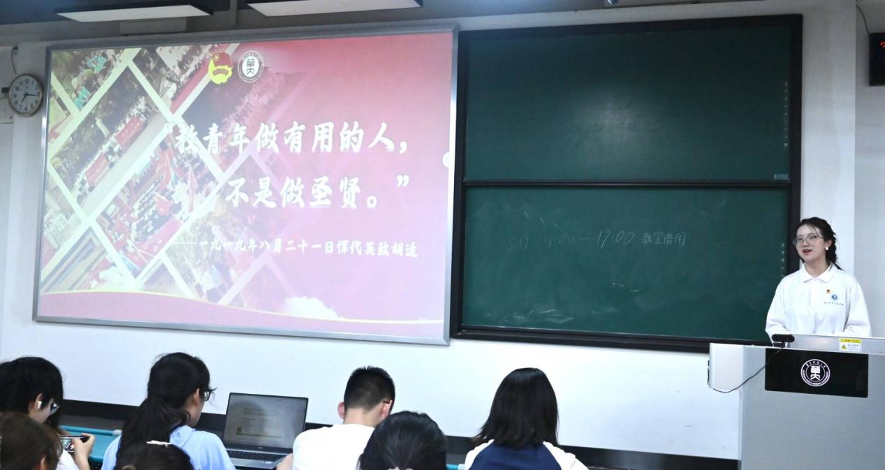恽代英青年讲师团成员柳恩溪,以其饱含激情的宣讲,引领2022级英语系、小语种全体同学,穿越历史的长河,感受时代的脉搏。宣讲分为回望过去,放眼当下,展望未来三部分。讲师团首先以陈延年、陈乔年事迹为例进行介绍,他们“革命者光明磊落,视死如归,只有站着死,绝不下跪”的精神引人深思,同时回顾了恽代英、夏明翰革命先辈的英勇事迹。“清澈的爱只为中国”,陈祥榕的话语彰显当代青年对国家召唤的积极回应。最后“展望未来路,寄语华大青年”,激励华师学子在恽代英精神的指引下,传承先辈意志,担当时代使命。