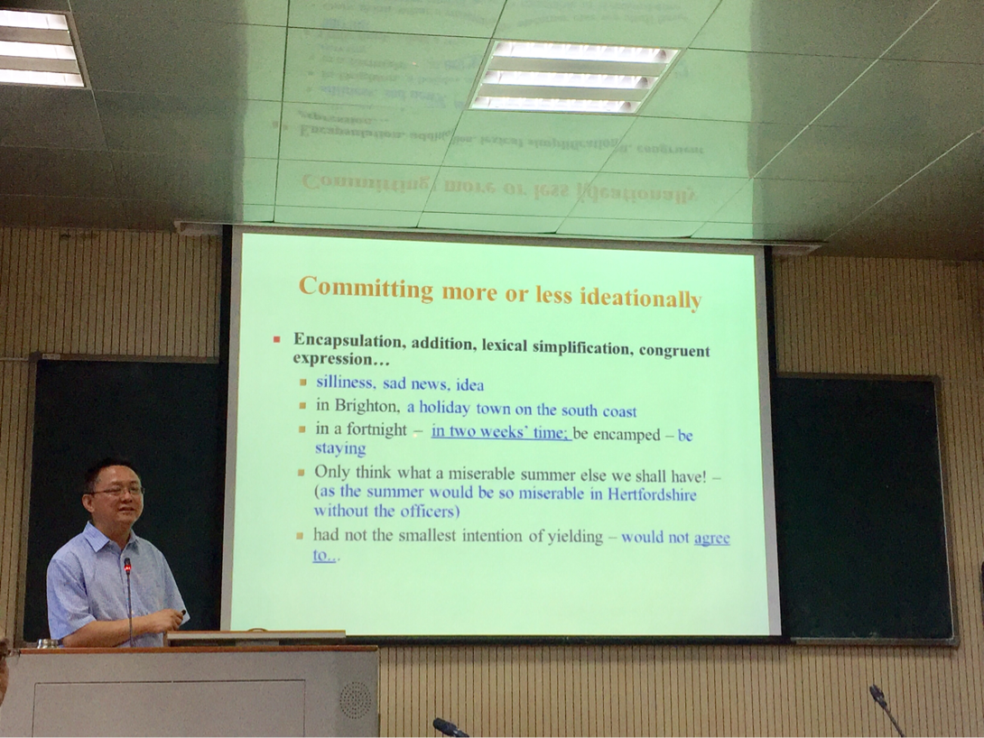 常晨光教授的讲授主要介绍从系统功能语言学的角度研究翻译,强调翻译过程中原文和译文在同一语境中要注重功能的对等,同时强调了翻译的“再实例化”(Re-instantiation),从Coupling和Commitment两个角度进行分析,并以《傲慢与偏见》为例,从人际意义、概念意义和语篇意义对原文译文进行了对比分析。
